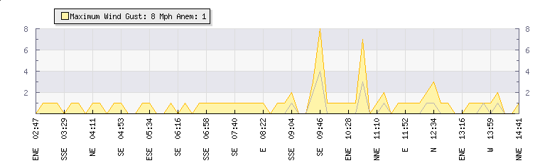 In the last few minutes the wind was East North East at an average speed of 0 mph, reaching up to 0 mph and a low of 0 mph. The gust strength is0 mph above the minimum speed |