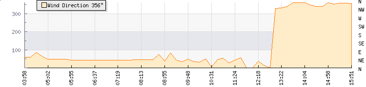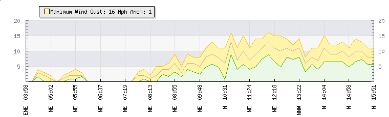 In the last few minutes the wind was North North East at an average speed of 10 mph, reaching up to 15 mph and a low of 5 mph. The gust strength is10 mph above the minimum speed |