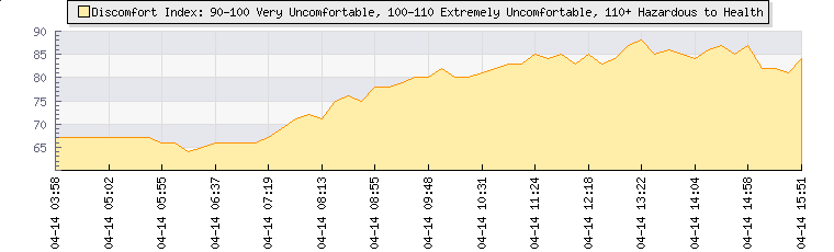 | Wind Speed: | 5|10|15 mph | Wind Direction: | NNE 13° | Temperature: | 22.8°C | | Wet Bulb: | 17.6°C | Discomfort: | 83 | Humidity: | 60% | | Rainfall Today: | 0mm | 12 hrs Rainfall: | 0mm | 24 hrs Rainfall: | 7mm | | Barometer: | 1022.9mb | Dew Point: | 14.6°C | Clouds AGL: | 3272ft (997 m) | | Density-Alt: | 7300ft (2225 m) | Fire Danger: | |
