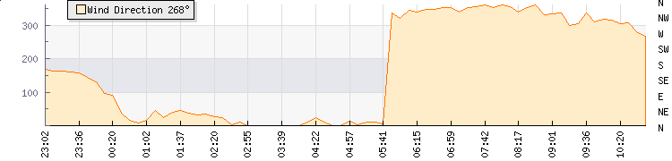 In the last few minutes the wind was North Westerly at an average speed of 11 kmh, reaching up to 16 kmh and a low of 6 kmh. The gust strength is10 kmh above the minimum speed |