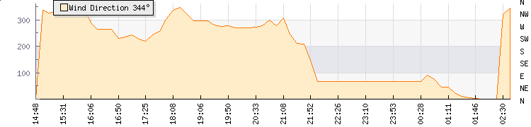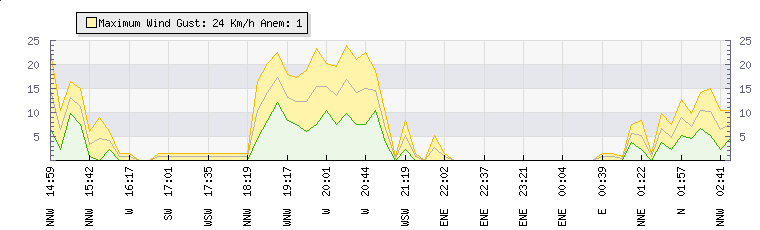 In the last few minutes the wind was North North West at an average speed of 17 kmh, reaching up to 23 kmh and a low of 11 kmh. The gust strength is12 kmh above the minimum speed |