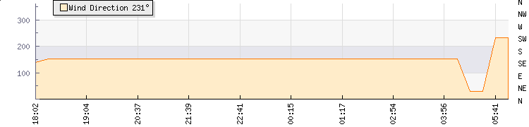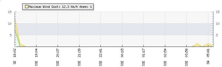 In the last few minutes the wind was South South East at an average speed of 0 kmh, reaching up to 0 kmh and a low of 0 kmh. The gust strength is0 kmh above the minimum speed |
