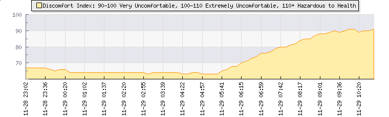 | Wind Speed: | 6|11|16 kmh | Wind Direction: | NW 315° | Temperature: | 26°C | | Wet Bulb: | 19.9°C | Discomfort: | 91 | Humidity: | 57% | | Rainfall Today: | 3.2mm | 12 hrs Rainfall: | 3.2mm | 24 hrs Rainfall: | 3.4mm | | Barometer: | 1012.3mb | Dew Point: | 16.8°C | Clouds AGL: | 3675ft (1120 m) | | Density-Alt: | 6978ft (2127 m) | Fire Danger: | |