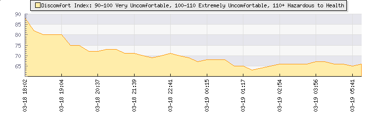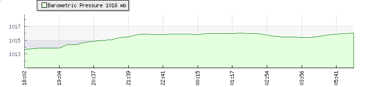 | Wind Speed: | 0|0|0 kmh | Wind Direction: | SSE 152° | Temperature: | 14.7°C | | Wet Bulb: | 13.9°C | Discomfort: | 67 | Humidity: | 93% | | Rainfall Today: | 0mm | 12 hrs Rainfall: | 0mm | 24 hrs Rainfall: | 7.2mm | | Barometer: | 1015.4mb | Dew Point: | 13.6°C | Clouds AGL: | 449ft (137 m) | | Density-Alt: | 5571ft (1698 m) | Fire Danger: | |