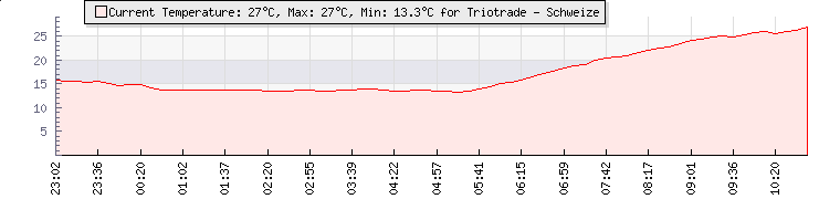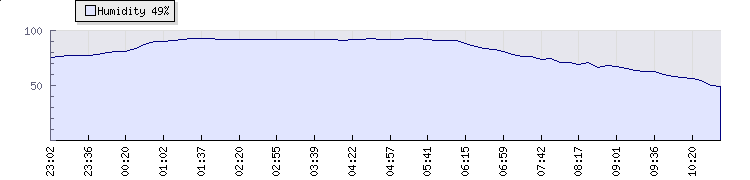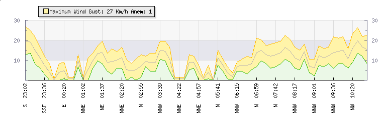 | Wind Gust: | 23 km/h | Min Temp: | 13.3 °C | Max Temp: | 26 °C | | Wind Average: | 17 km/h | Min Hum: | 57 % | Max Hum: | 93 % | |  |