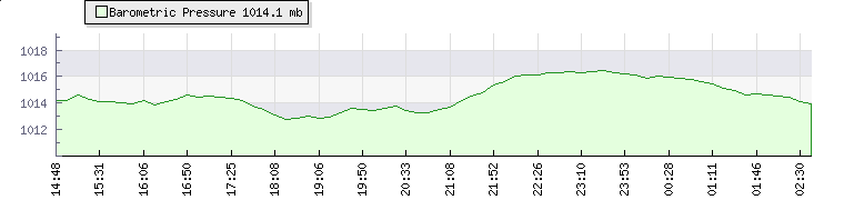 | Wind Speed: | 11|17|23 kmh | Wind Direction: | NNW 330° | Temperature: | 18.6°C | | Wet Bulb: | 16.6°C | Discomfort: | 77 | Humidity: | 83% | | Rainfall Today: | 0mm | 12 hrs Rainfall: | 0mm | 24 hrs Rainfall: | 0mm | | Barometer: | 1014.8mb | Dew Point: | 15.7°C | Clouds AGL: | 1179ft (359 m) | | Density-Alt: | 6063ft (1848 m) | Fire Danger: | |