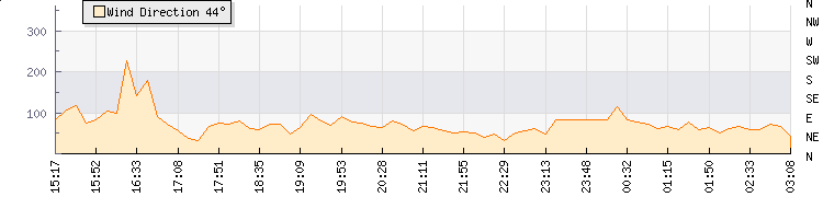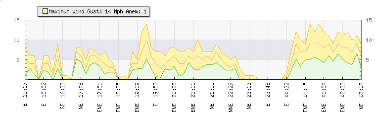 In the last few minutes the wind was East South East at an average speed of 0 mph, reaching up to 0 mph and a low of 0 mph. The gust strength is0 mph above the minimum speed |