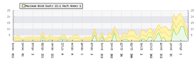 In the last few minutes the wind was East South East at an average speed of 8 kmh, reaching up to 12 kmh and a low of 3 kmh. The gust strength is9 kmh above the minimum speed |