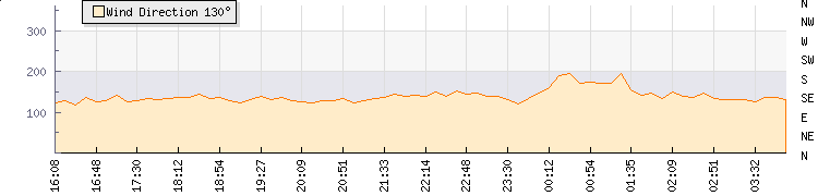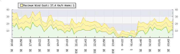 In the last few minutes the wind was South South East at an average speed of 14 kmh, reaching up to 19 kmh and a low of 9 kmh. The gust strength is10 kmh above the minimum speed |
