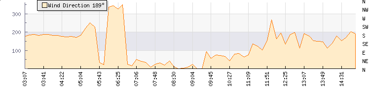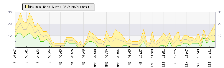 In the last few minutes the wind was South South East at an average speed of 12 kmh, reaching up to 19 kmh and a low of 5 kmh. The gust strength is14 kmh above the minimum speed |
