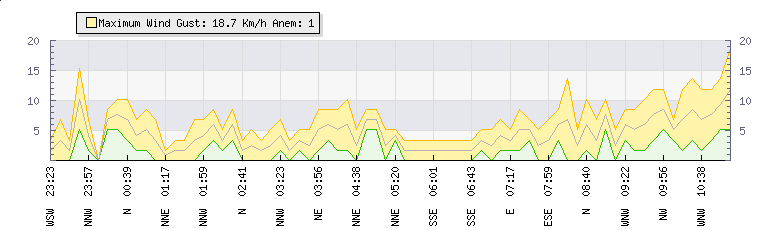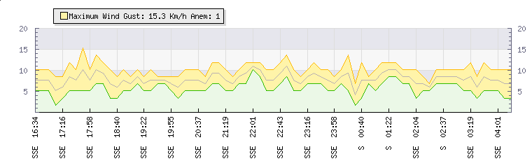 In the last few minutes the wind was South South East at an average speed of 8 kmh, reaching up to 10 kmh and a low of 5 kmh. The gust strength is5 kmh above the minimum speed |