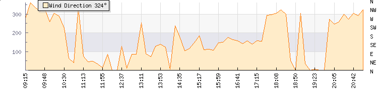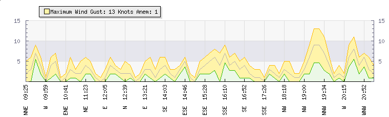 In the last few minutes the wind was Northerly at an average speed of 9 knots, reaching up to 13 knots and a low of 5 knots. The gust strength is8 knots above the minimum speed |
