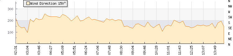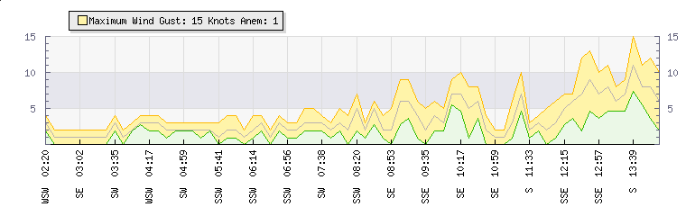 In the last few minutes the wind was South South East at an average speed of 4 knots, reaching up to 6 knots and a low of 3 knots. The gust strength is3 knots above the minimum speed |