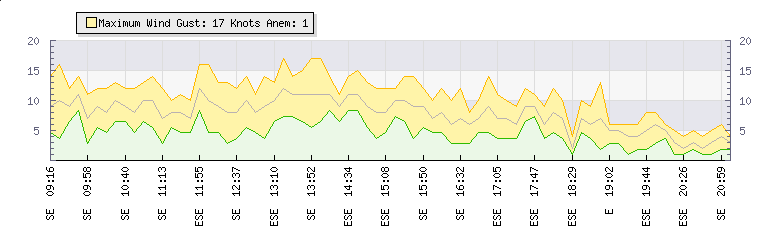 In the last few minutes the wind was East South East at an average speed of 5 knots, reaching up to 8 knots and a low of 2 knots. The gust strength is6 knots above the minimum speed |
