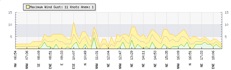 In the last few minutes the wind was East North East at an average speed of 2 knots, reaching up to 4 knots and a low of 0 knots. The gust strength is4 knots above the minimum speed |