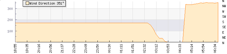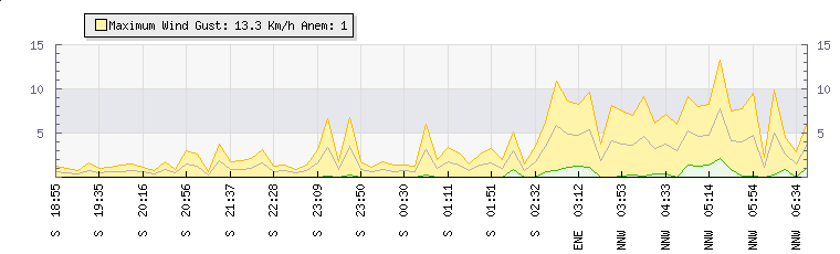 In the last few minutes the wind was North North West at an average speed of 5 kmh, reaching up to 8 kmh and a low of 1 kmh. The gust strength is7 kmh above the minimum speed |