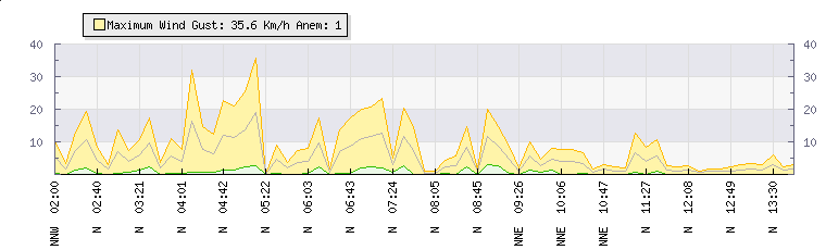 In the last few minutes the wind was Northerly at an average speed of 1 kmh, reaching up to 3 kmh and a low of 0 kmh. The gust strength is3 kmh above the minimum speed |