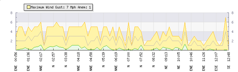 In the last few minutes the wind was East North East at an average speed of 1 mph, reaching up to 2 mph and a low of 0 mph. The gust strength is2 mph above the minimum speed |