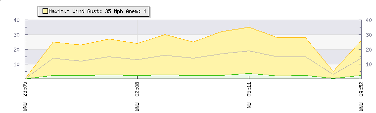 In the last few minutes the wind was West North West at an average speed of 3 mph, reaching up to 5 mph and a low of 0 mph. The gust strength is5 mph above the minimum speed |