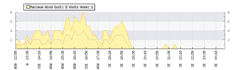 In the last few minutes the wind was North Westerly at an average speed of 1 knots, reaching up to 3 knots and a low of 0 knots. The gust strength is3 knots above the minimum speed |