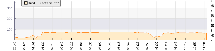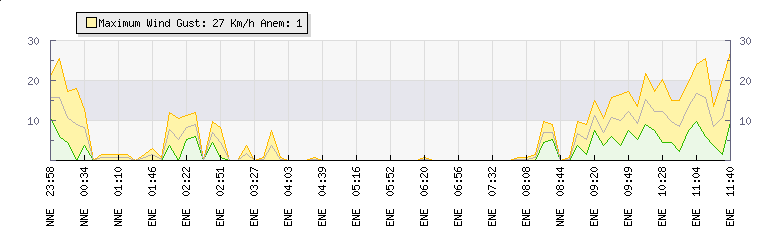 In the last few minutes the wind was East North East at an average speed of 12 kmh, reaching up to 20 kmh and a low of 5 kmh. The gust strength is15 kmh above the minimum speed |