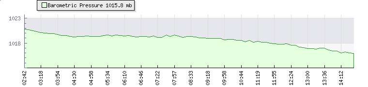 | Wind Speed: | 14|20|27 kmh | Wind Direction: | NNE 26° | Temperature: | 23.5°C | | Wet Bulb: | 19.4°C | Discomfort: | 87 | Humidity: | 69% | | Rainfall Today: | 3.1mm | 12 hrs Rainfall: | 3.1mm | 24 hrs Rainfall: | 3.1mm | | Barometer: | 1016.8mb | Dew Point: | 17.4°C | Clouds AGL: | 2409ft (734 m) | | Density-Alt: | 1148ft (350 m) | Fire Danger: | |