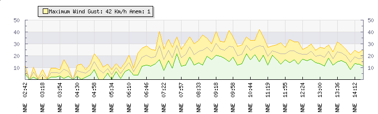 In the last few minutes the wind was North North East at an average speed of 20 kmh, reaching up to 27 kmh and a low of 14 kmh. The gust strength is13 kmh above the minimum speed |
