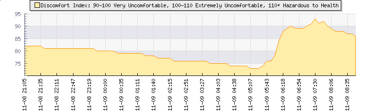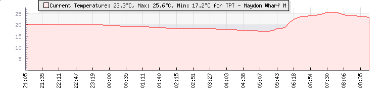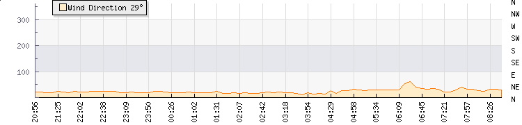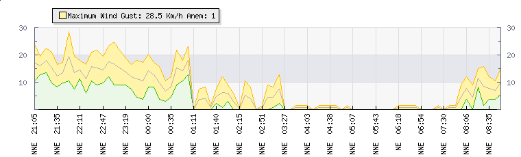 | Wind Gust: | 23 km/h | Min Temp: | 20 °C | Max Temp: | 26.6 °C | | Wind Average: | 18 km/h | Min Hum: | 80 % | Max Hum: | 86 % | |  |