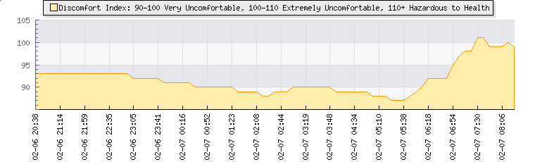 | Wind Speed: | 0|1|2 kmh | Wind Direction: | NNE 16° | Temperature: | 30.4°C | | Wet Bulb: | 26.7°C | Discomfort: | 108 | Humidity: | 75% | | Rainfall Today: | 0mm | 12 hrs Rainfall: | 0mm | 24 hrs Rainfall: | 0mm | | Barometer: | 1015.5mb | Dew Point: | 25.4°C | Clouds AGL: | 1977ft (603 m) | | Density-Alt: | 2129ft (649 m) | Fire Danger: | |