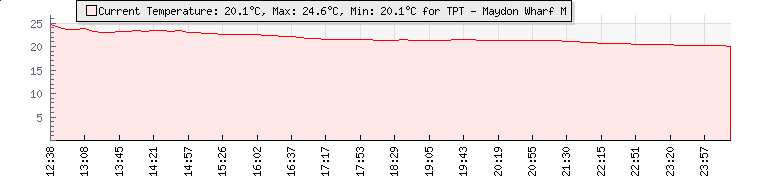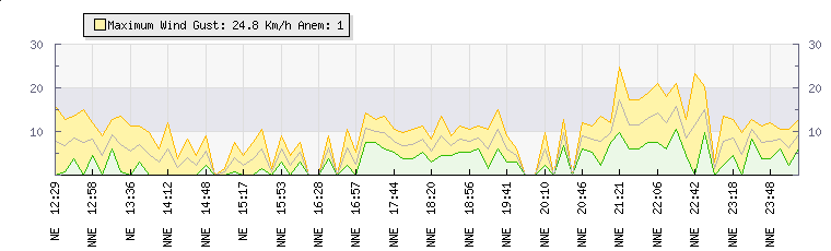 Wind Gust: | 25 km/h | Min Temp: | 20.4 °C | Max Temp: | 29.9 °C | Wind Average: | 17 km/h | Min Hum: | 65 % | Max Hum: | 95 % | |  |