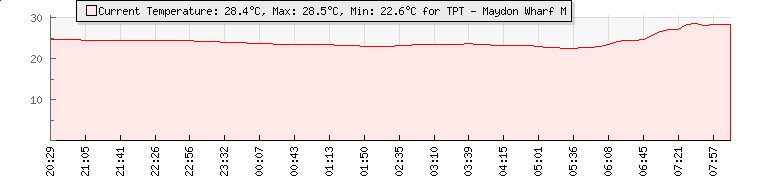 | Wind Gust: | 13 km/h | Min Temp: | 26 °C | Max Temp: | 30.4 °C | | Wind Average: | 9 km/h | Min Hum: | 75 % | Max Hum: | 83 % | |  |