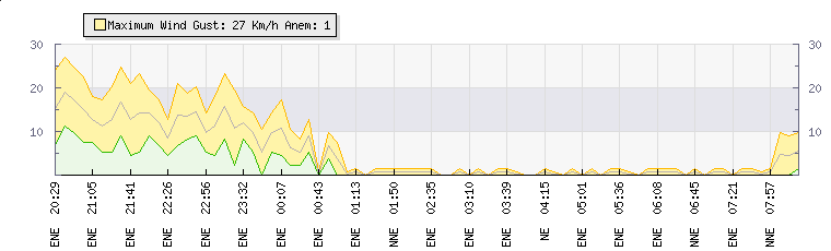 In the last few minutes the wind was North North East at an average speed of 1 kmh, reaching up to 2 kmh and a low of 0 kmh. The gust strength is2 kmh above the minimum speed |