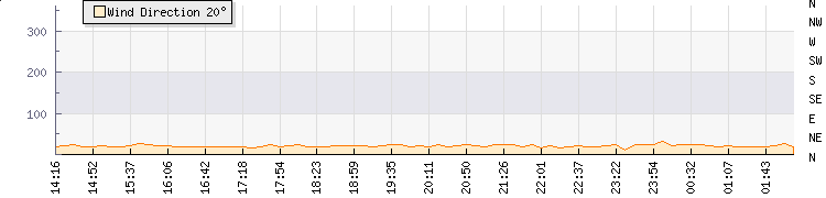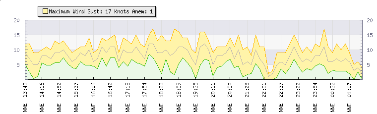 | Wind Gust: | 17 knots | Min Temp: | 20 °C | Max Temp: | 28.8 °C | | Wind Average: | 12 knots | Min Hum: | 58 % | Max Hum: | 95 % | |  |