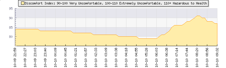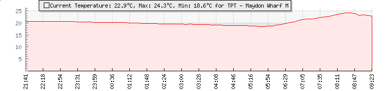 Wind Gust: | 7 knots | Min Temp: | 22.8 °C | Max Temp: | 23.4 °C | Wind Average: | 3 knots | Min Hum: | 91 % | Max Hum: | 93 % | |  |