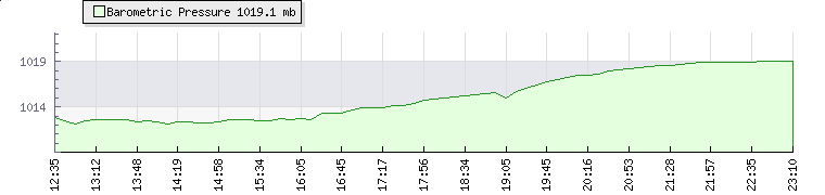 | Wind Speed: | 1|3|5 knots | Wind Direction: | ENE 69° | Temperature: | 19.4°C | | Wet Bulb: | 18.9°C | Discomfort: | 81 | Humidity: | 96% | | Rainfall Today: | 10.1mm | 12 hrs Rainfall: | 10.1mm | 24 hrs Rainfall: | 10.1mm | | Barometer: | 1018.6mb | Dew Point: | 18.7°C | Clouds AGL: | 262ft (80 m) | | Density-Alt: | 633ft (193 m) | Fire Danger: | |
