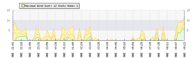 In the last few minutes the wind was North North East at an average speed of 0 knots, reaching up to 0 knots and a low of 0 knots. The gust strength is0 knots above the minimum speed |