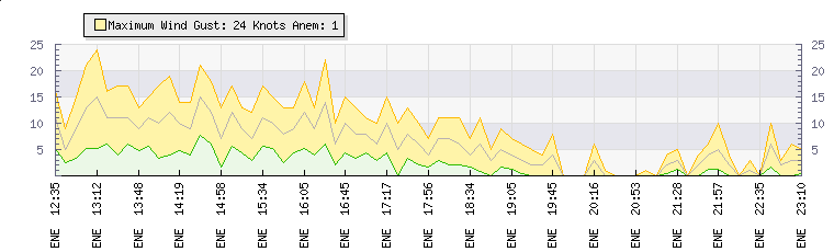 In the last few minutes the wind was East North East at an average speed of 3 knots, reaching up to 5 knots and a low of 1 knots. The gust strength is4 knots above the minimum speed |