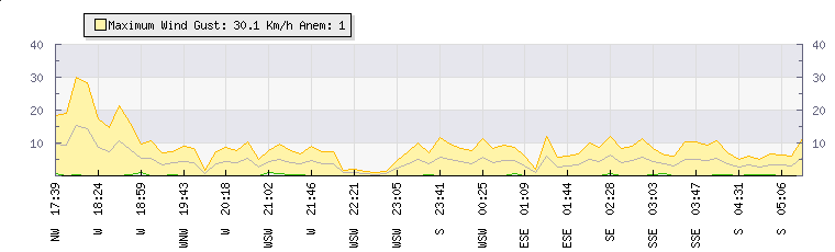 In the last few minutes the wind was South Easterly at an average speed of 5 kmh, reaching up to 10 kmh and a low of 0 kmh. The gust strength is10 kmh above the minimum speed |