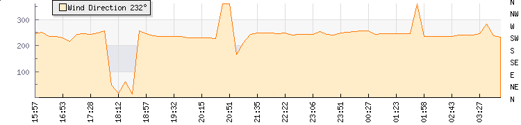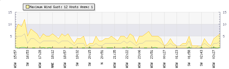 In the last few minutes the wind was South Westerly at an average speed of 1 knots, reaching up to 1 knots and a low of 0 knots. The gust strength is1 knots above the minimum speed |