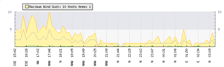 In the last few minutes the wind was Easterly at an average speed of 1 knots, reaching up to 2 knots and a low of 0 knots. The gust strength is2 knots above the minimum speed |
