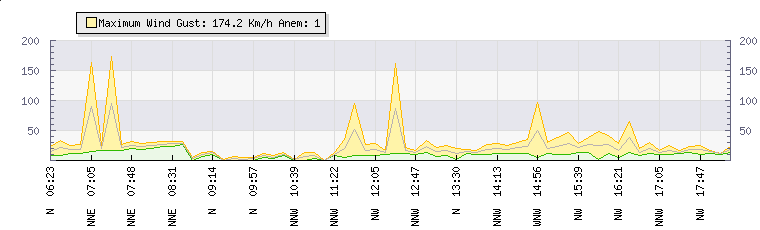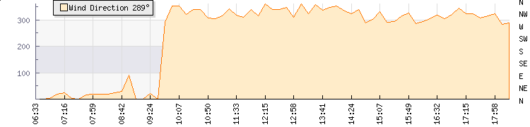 In the last few minutes the wind was North Westerly at an average speed of 7 kmh, reaching up to 13 kmh and a low of 0 kmh. The gust strength is13 kmh above the minimum speed |