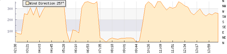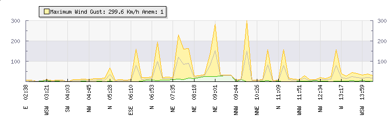 In the last few minutes the wind was West South West at an average speed of 80 kmh, reaching up to 158 kmh and a low of 3 kmh. The gust strength is155 kmh above the minimum speed |