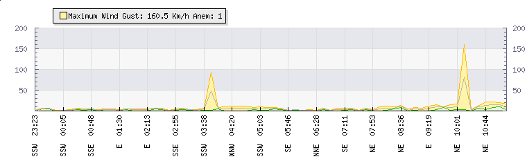 In the last few minutes the wind was Easterly at an average speed of 6 kmh, reaching up to 12 kmh and a low of 0 kmh. The gust strength is12 kmh above the minimum speed |