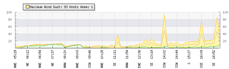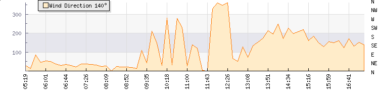 In the last few minutes the wind was South South West at an average speed of 5 knots, reaching up to 10 knots and a low of 1 knots. The gust strength is9 knots above the minimum speed |