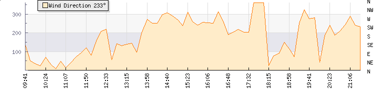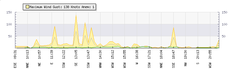 In the last few minutes the wind was South Westerly at an average speed of 10 knots, reaching up to 19 knots and a low of 1 knots. The gust strength is18 knots above the minimum speed |