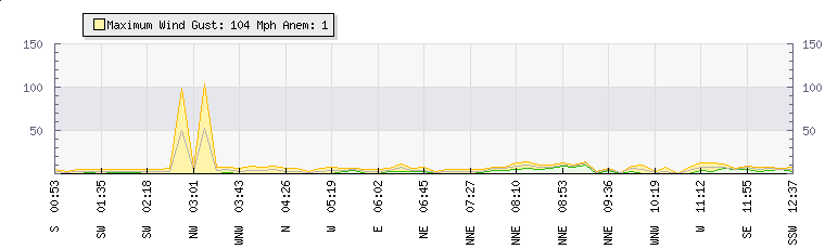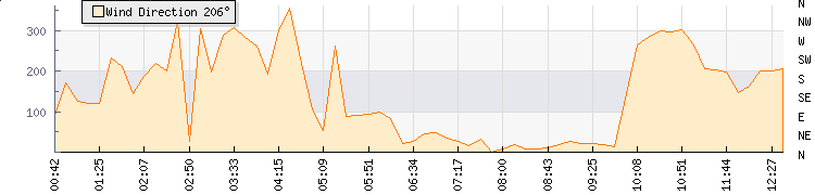 In the last few minutes the wind was Westerly at an average speed of 7 mph, reaching up to 12 mph and a low of 3 mph. The gust strength is9 mph above the minimum speed |