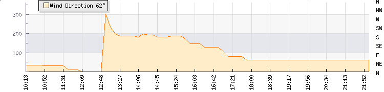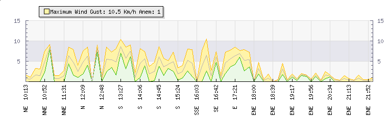 In the last few minutes the wind was East North East at an average speed of 0 kmh, reaching up to 0 kmh and a low of 0 kmh. The gust strength is0 kmh above the minimum speed |