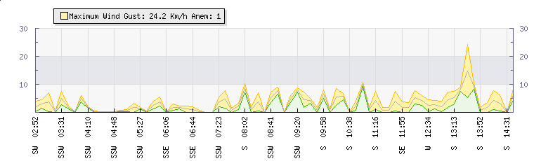 In the last few minutes the wind was North North East at an average speed of 1 kmh, reaching up to 2 kmh and a low of 0 kmh. The gust strength is2 kmh above the minimum speed |