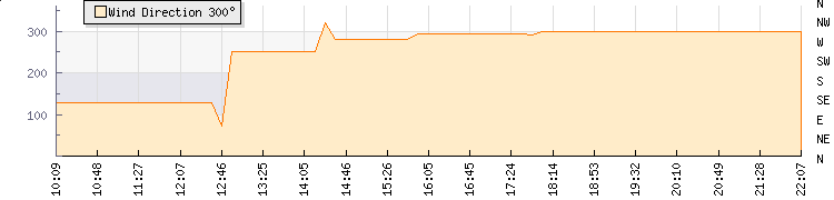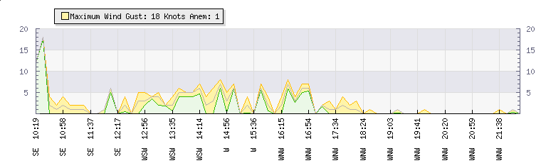 In the last few minutes the wind was West North West at an average speed of 0 knots, reaching up to 0 knots and a low of 0 knots. The gust strength is0 knots above the minimum speed |