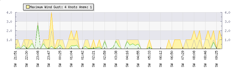 In the last few minutes the wind was South Westerly at an average speed of 1 knots, reaching up to 1 knots and a low of 0 knots. The gust strength is1 knots above the minimum speed |